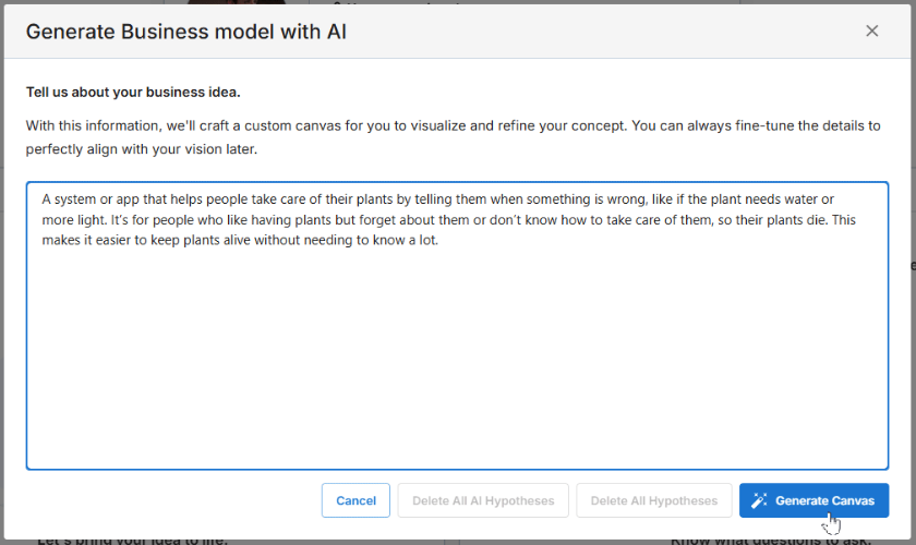 Add a brief description of your idea and any aspects you think are important to know for Canvas generation such as customer segments, the problem you're solving, etc. Then click on "Generate Canvas".