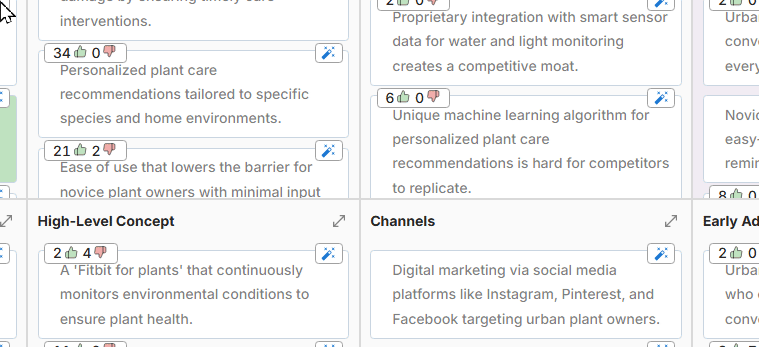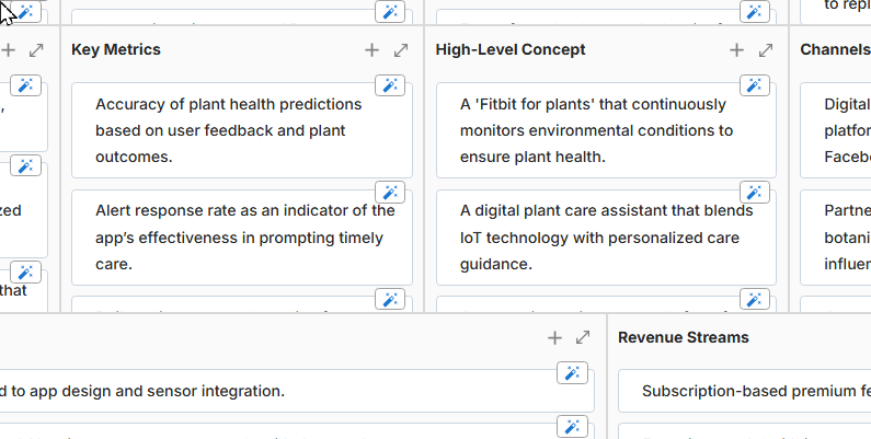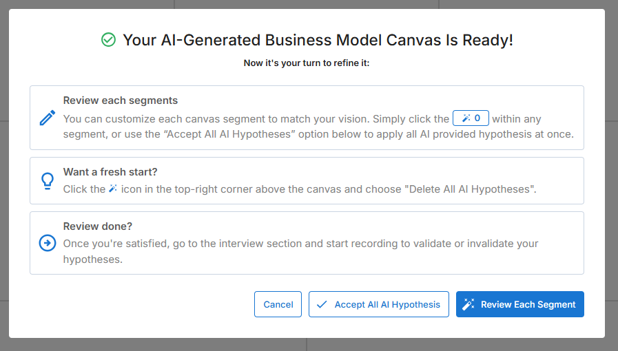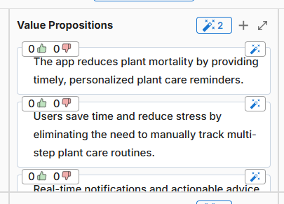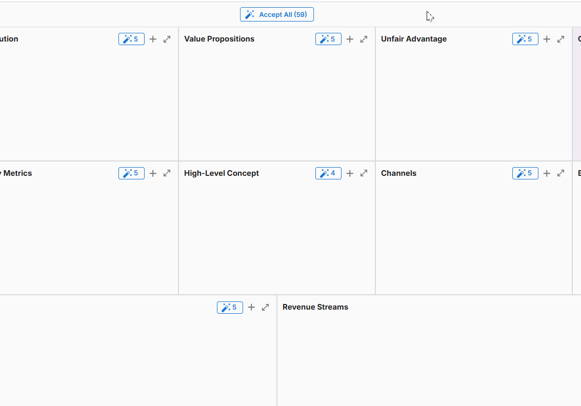 Locate the magic wand icon within each Canvas section to review the suggested hypotheses for them. Select the hypotheses you want to add to your Canvas then click "Accept" and/or select hypotheses that you don't want to include and click "Reject".