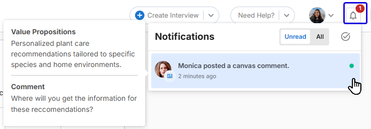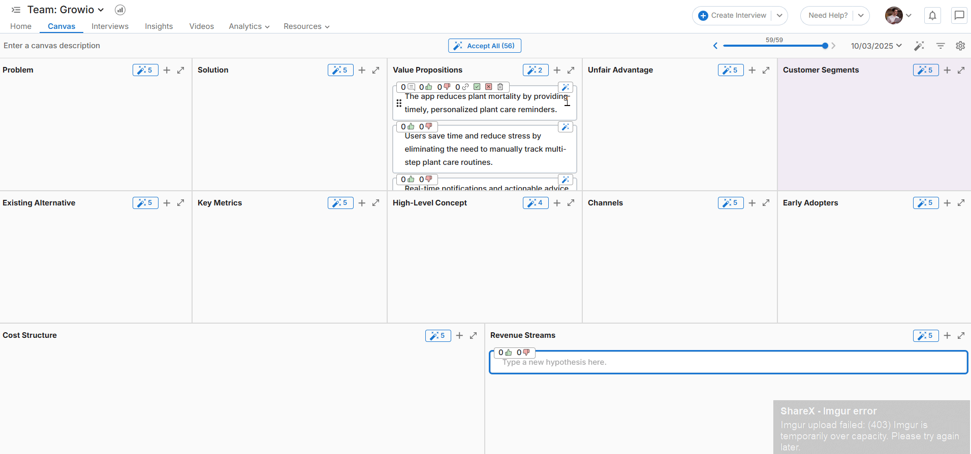 See how team's Customer Discovery Interviews reflect back to their Canvas by viewing linked Insights when you hover over a hypothesis.