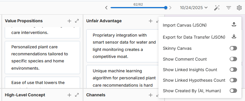Simplify your early Canvas validation by focusing on the sections of the Canvas that matter most. Toggle on the Skinny Canvas in your gear menu and work on validating these hypotheses before getting into the full Canvas.