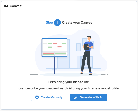 - From the Canvas Feature: Just below your avatar menu, find the magic wand icon labeled "Generate Business model with AI", clicking this will open the AI Canvas editor, allowing you to provide a description of your idea for Canvas and Interview Template generation.