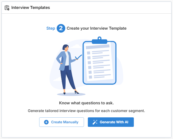 Turn your Customer Segments into practical interview templates. For each Customer Segment outlined in your Canvas, AI generates customized customer discovery questions. These questions help you validate your business model and kickstart your interviews. Create or Access these templates from the Home page under the "Interview Templates" section or via the Interviews feature by clicking the “View Templates” button. Templates can be adjusted by team members as needed. To trigger the creation of interview templates you'll want to be on the Home page.
