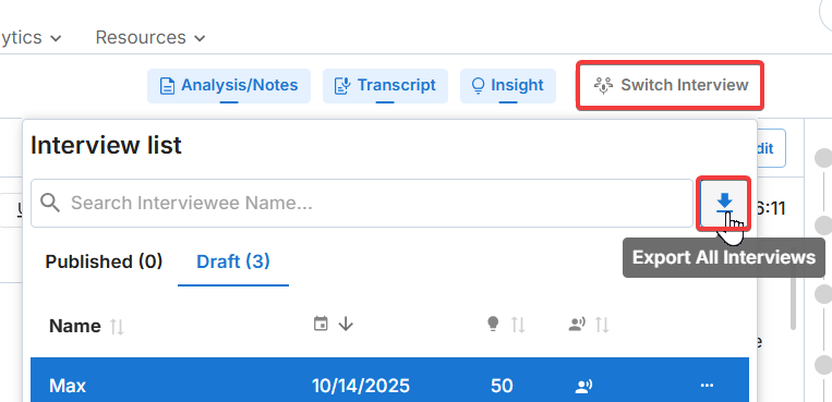 From your Published or Drafts interview list click the "Export All Interviews" icon to export an HTML file with all of your team's interviews data.