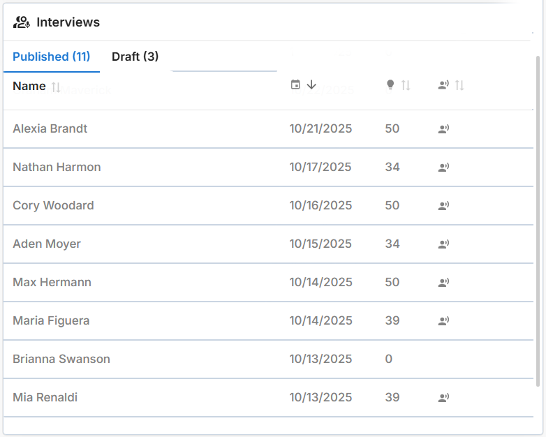 - The Interviews section lists your draft and published interviews.