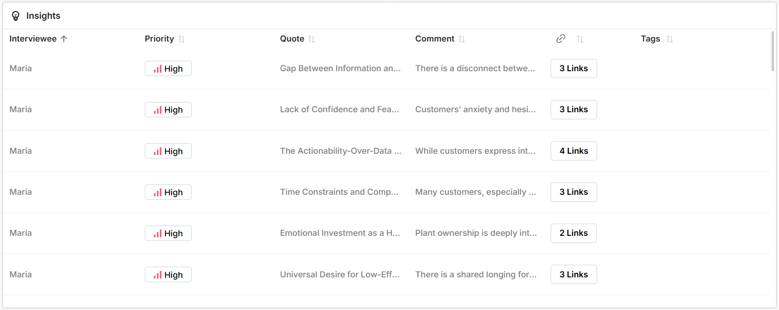 - The Insights section shows patterns and key takeaways from your interviews.