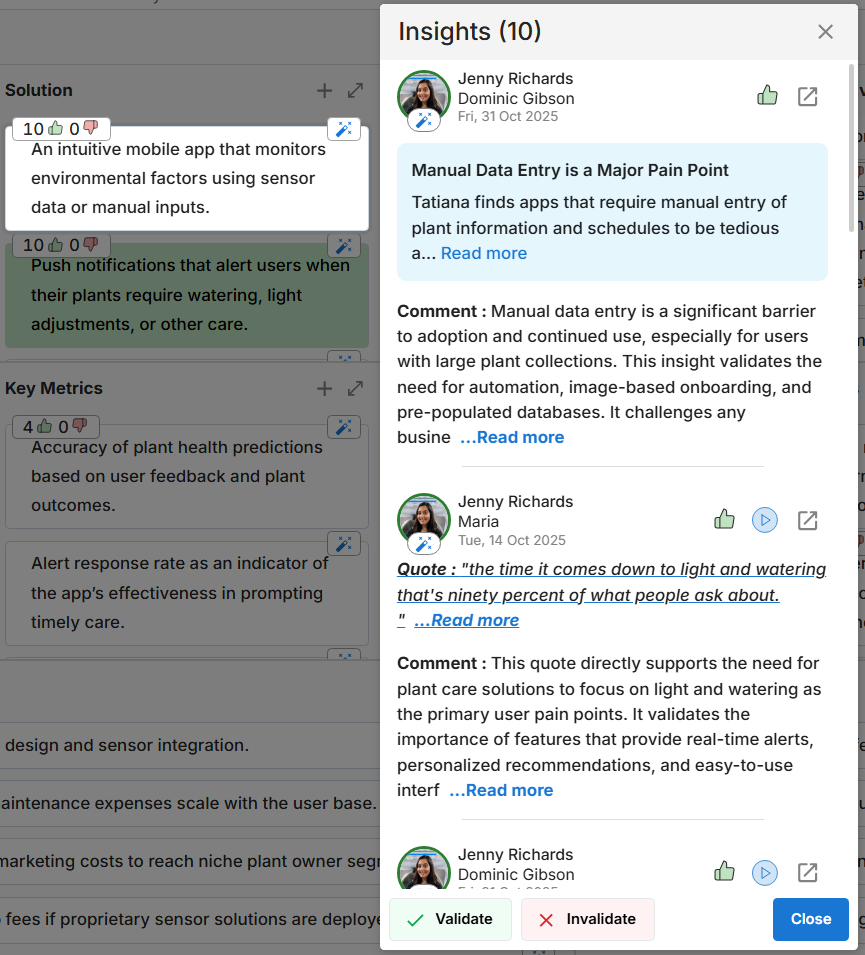Linked insights are especially valuable because they connect what you’re learning directly to the assumptions you’ve mapped out on your Canvas. This helps you see which parts of your idea are supported by evidence and which might need to change.