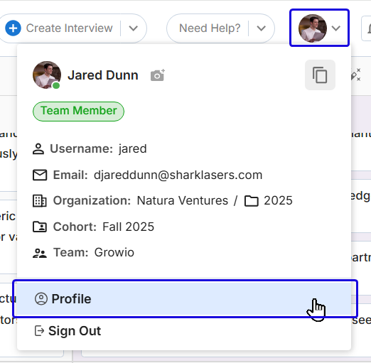 Click your avatar in the upper right corner of the platform and select "Profile".
